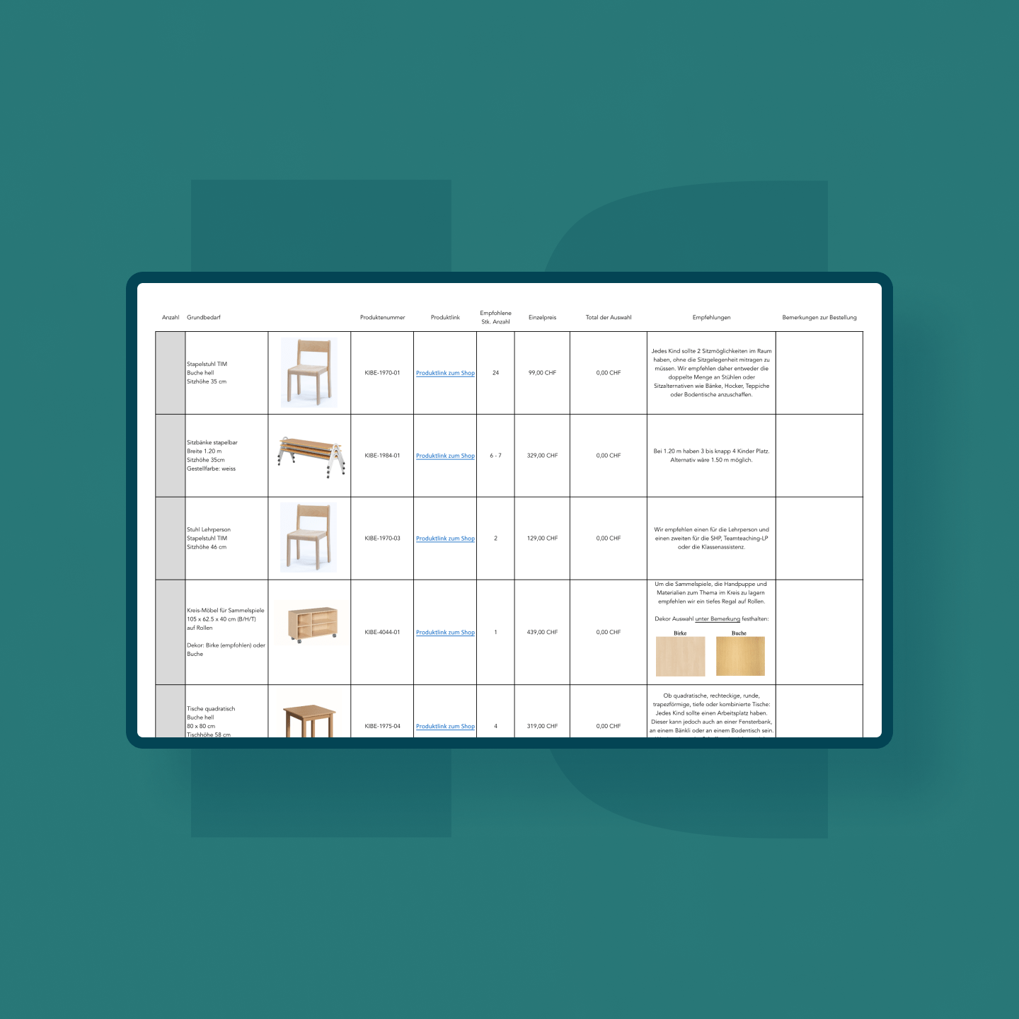 La liste d'inventaire a été créée en étroite collaboration avec kinna.ch – un spécialiste indépendant en design d’intérieur pour les jardins d’enfants.