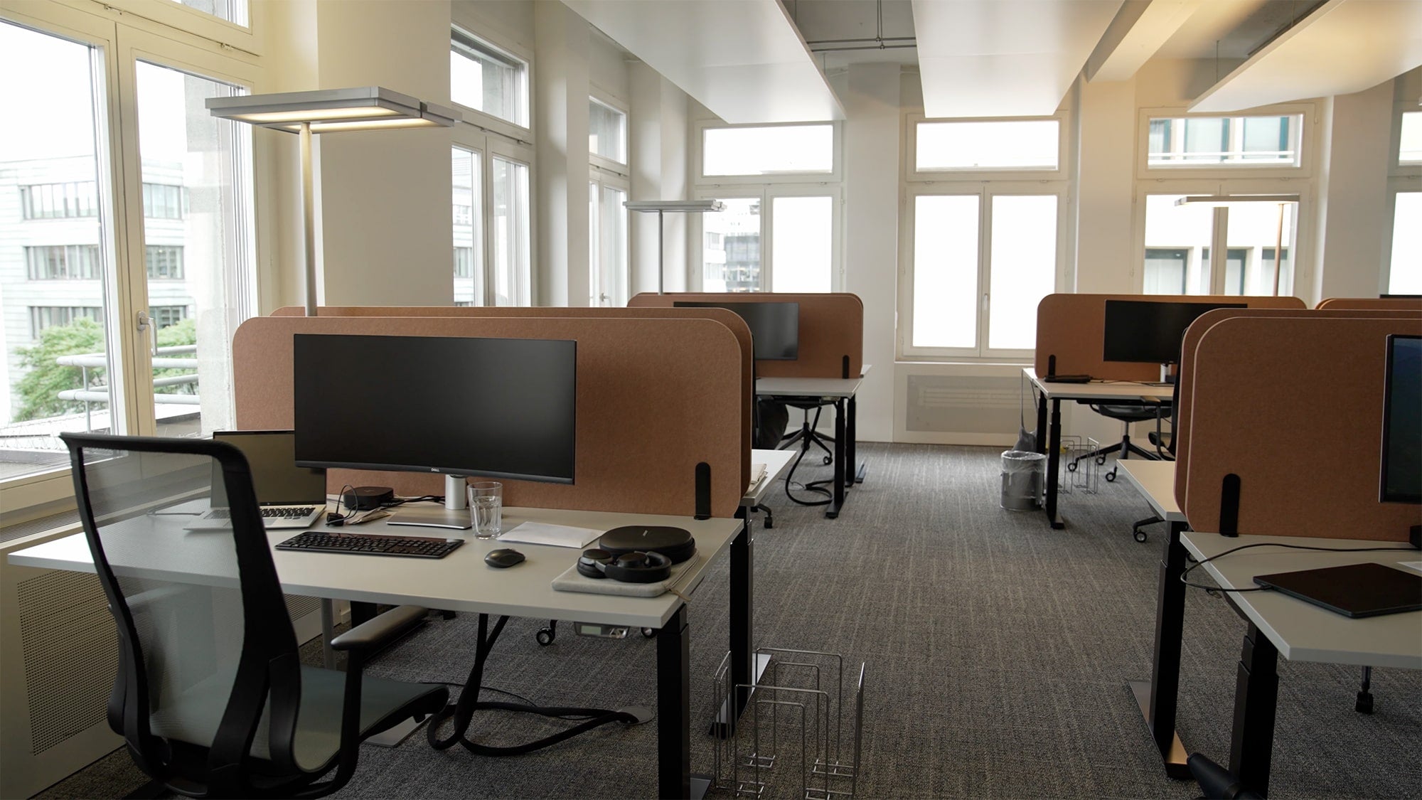 Durch eine sorgfältige Planung entstanden fokussierte, ergonomische Arbeitsplätze, die dank massgeschneiderter Akustiktrennwände optimal abgeschirmt sind. kibemo setzte dabei auf hochwertige Standardarbeitsplätze mit langlebigen Tischen und Bürostühlen, die den täglichen Anforderungen eines anspruchsvollen Office-Alltags gerecht werden.