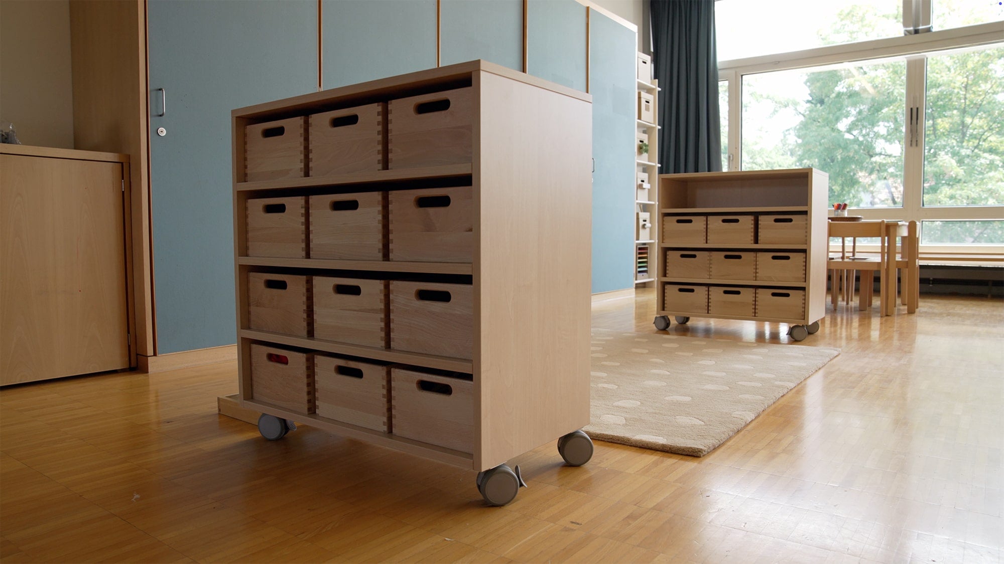 Mit sorgfältiger Planung entstanden gut strukturierte Zonen für einen abwechslungsreichen Unterricht, wobei kibemo die komplette Möblierung verantwortete. Das Herzstück der Einrichtung bildet der massgeschneiderte Sitzkreis – bestehend aus eigens entwickelten Sitzbänken mit integrierten Ablagen sowie einem individuell gefertigten Spielteppich von Trefort.